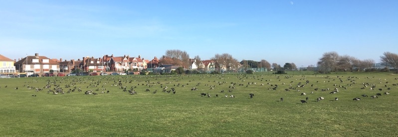 Off shore: 338 Brent Geese, 23 Shelduck (Feeding along
