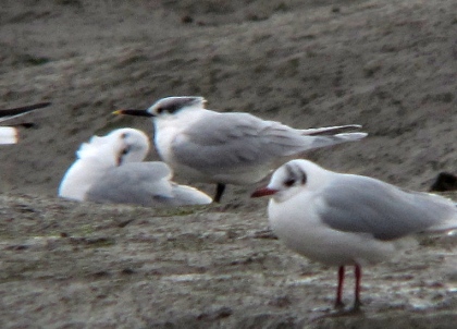 Plover, 2 Sandwich Terns flying east, a Great Crested